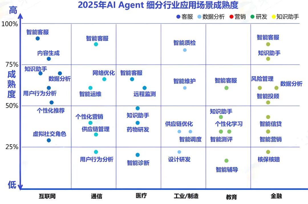 目前 Agent 行业渗透:智能客服约70%,成为最成熟场景; 数据分析约60%,是业务决策的核心支撑;内容创作约45%;研发设计、营销、知识助手、智能辅导等渗透率较低,场景孕育着下一轮爆发点。