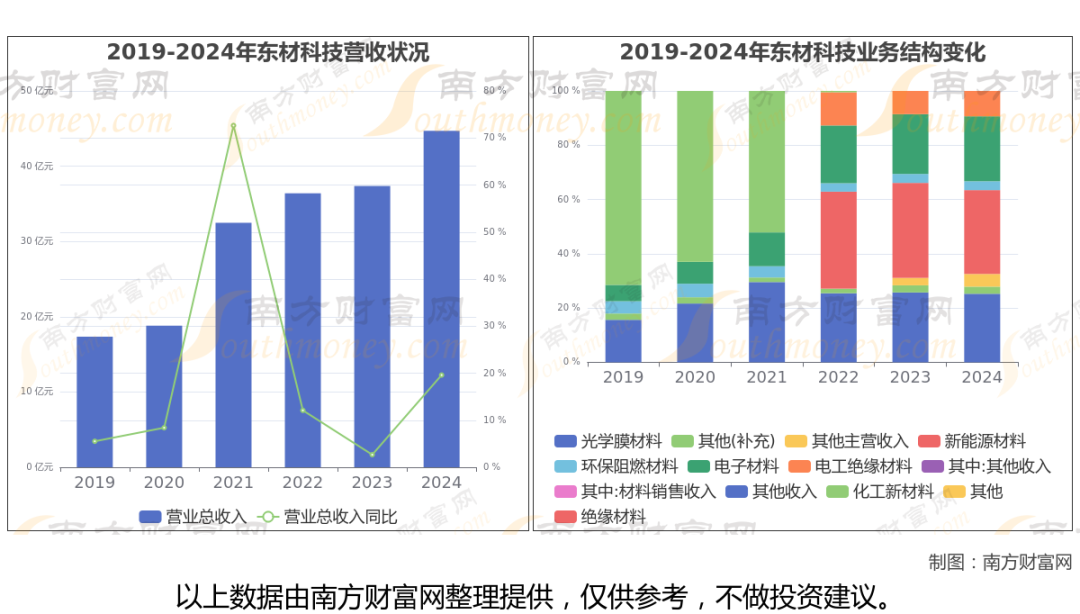东材科技财务数据显示(如上图): 2024年实现营业总收入 44.7亿,同比增长19.6%。近五年复合增长率(CAGR)为24.16%。