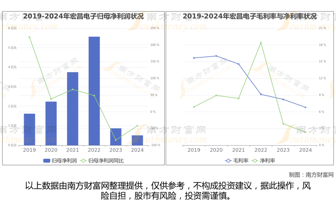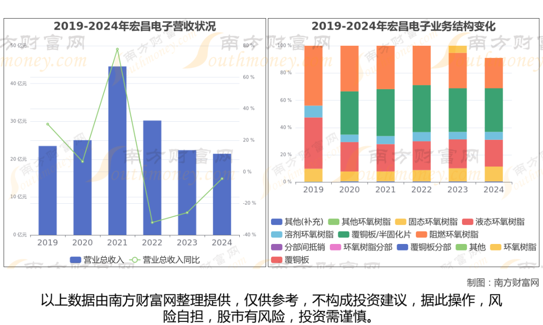 (如上图)2024年宏昌电子公司营业总收入21.44亿,同比增长-4.29%,近五年复合增长率为-3.8%。