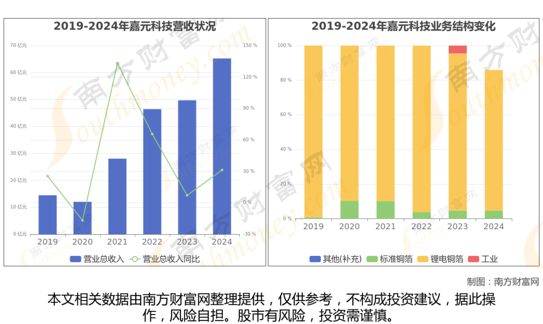 (如上图)嘉元科技2024年全年营业收入为65.22亿,同比增长31.27%,近五年复合年增长率52.62%。