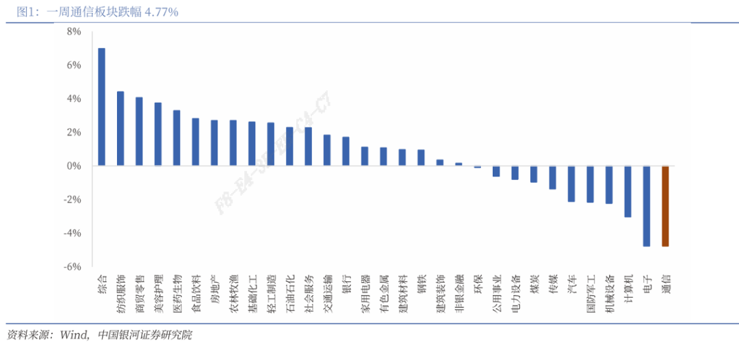 1. 一周通信板块指数下跌,通信网络技术服务、行业应用等子板块相关标的表现较好。
