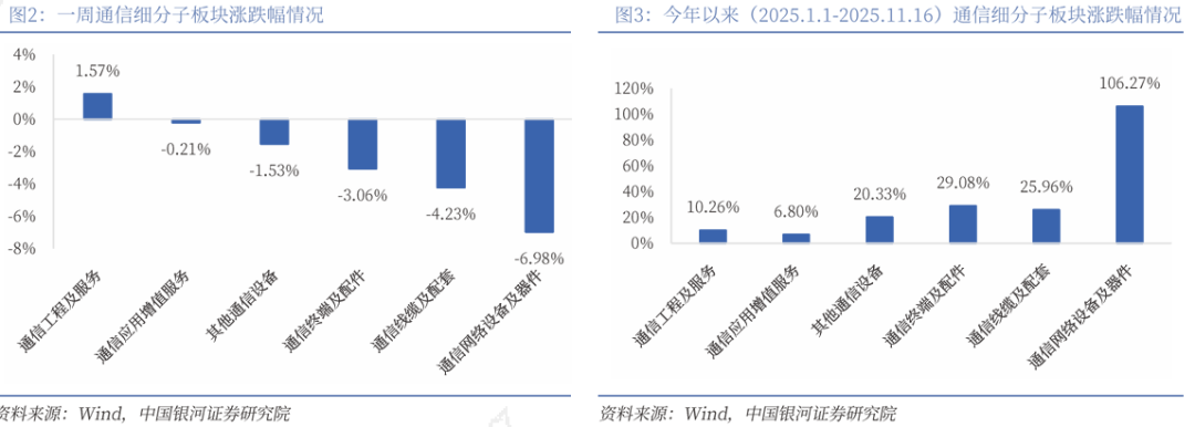 周行情:一周(2025年11月10日-2025年11月16日)上证指数跌幅为0.18%;深证成指跌幅为1.40%;创业板指数跌幅为3.01%;一级行业指数中,通信板块跌幅为4.77%。