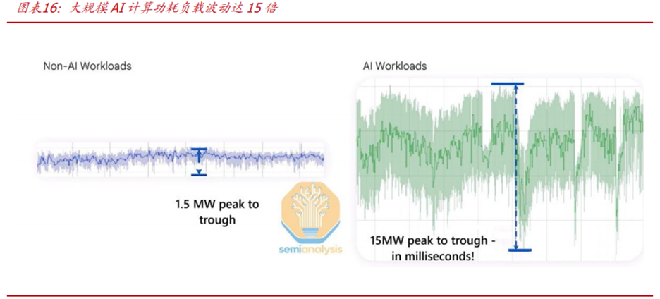 大规模AI计算会带来剧烈功率波动,从而对电网稳定提出前所未有的挑战。AIDC用电具有负荷集中、功率大且运行模式呈现全天候特征。传统云计算产生的电力波动很小,随着AI大模型训练规模急剧扩张至数万GPU集群,功耗的剧烈波动会造成数据中心电力负荷的剧烈波动。例如在训练大语言模型时,数千张GPU同步执行计算会导致机架的功耗在几毫秒内从约30%的“空闲”状态飙升至100%,再迅速回落。根据谷歌云,云数据中心和人工智能数据中心之间的负载波动存在约15倍的差异。这种剧烈波动不仅会对机柜级配电造成较大压力,当AI数据中心的整体规模足够大,意味着数亿瓦的功率在几秒钟内急剧变化,对公用电网的稳定性构成了直接威胁。而美国电网平均年龄超40年,审批一座新变电站需耗时数年,欧洲也面临电网老化和审批复杂的挑战,这种算力“指数级”飙升与电力供给“线性级”增长之间的结构性脱节所形成的矛盾日渐加剧。