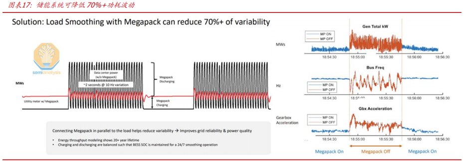 储能电池系统是解决AI功耗波动问题的绝佳方案,与传统UPS非替代而是配合使用。在面临负载波动时,兆瓦级储能电池系统可以通过快速充电和放电来管理电能质量问题,进而实现快速频率响应,使电池能够以适当的响应速度和功率输出应对数据中心负载的波动。根据Tesla,储能系统可以减少70% 的负载波动。同时,储能系统并非与现有UPS相互替代,而是作为一种补偿手段配合使用,用于弥补UPS在电压连续多次下降时跳闸离线的固有缺陷。如果UPS切换到离网运行模式,则BESS会利用电网负载进行充电,从而在UPS手动复位期间,为电网提供“模拟”负载。