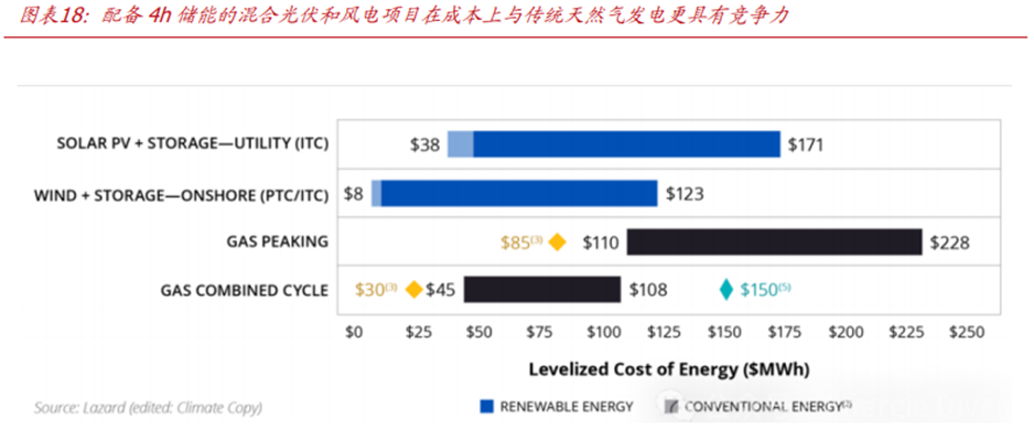 2)解决绿电供给不稳定的问题。AIDC电能消耗持续增加,“清洁化”绿电是全球行业发展方向。伴随AI的高渗透,数据中心用电规模持续扩大,能源清洁化成为AIDC重要话题。通过接入光伏、风电等清洁能源,不仅可以降低碳排放、降低数据中心PUE,在补贴下还具有经济效益。根据Lazard,2024年配备4h储能的混合光伏、风电项目在成本上与传统天然气发电更具有竞争力,MWh LCOE最低分别为38美元、8美元。目前,数据中心绿电在中美已实现共振,是产业发展的明确方向: