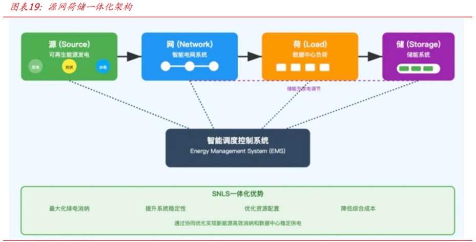 储能是数据中心接入绿电的“桥梁”,多巨头布局“绿电 储能”一体化项目。由于光伏、风电供给不稳定,与数据中心用能“安全性”原则相悖,因此需依靠储能解决供电不稳定的问题,提高风光能源的使用,实现碳排放的降低。目前实现绿电的方式主要为购买绿电(绿证)为主、自发电为辅,而自发电体量从低到高又包括了自备屋顶/分布式光伏、微电网(包括风、光、储一体化)、源网荷储(包括风、光、储,以及电网、数据中心一体化)。目前腾讯、阿里、字节等头部互联网厂商均开始布局“风、光、储一体化微电网”或终极“源网荷储一体化”项目,推动绿电直连、独立储能与算力的深度融合: