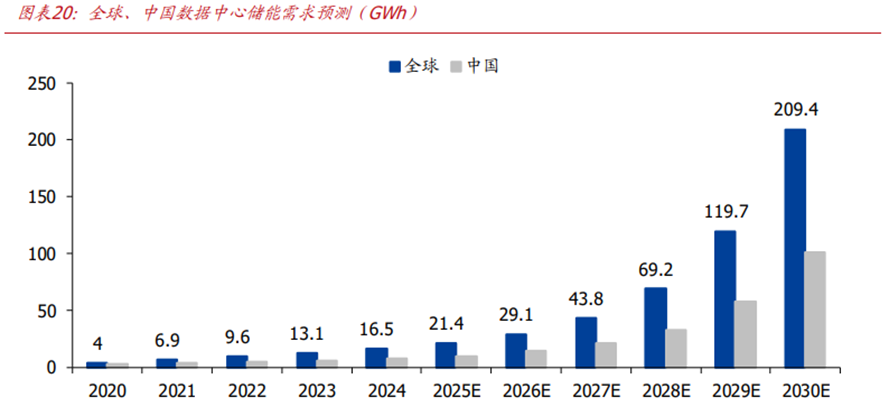 根据双登股份招股书,预计2030年全球数据中心储能需求将由2024年的16.5GWh增长至209.4GWh;国内数据中心储能市场由8GWh增长至101.6GWh。
