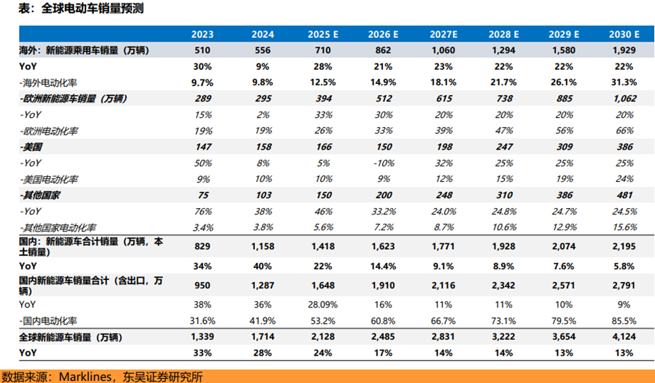 预计全球电动车25年销量2128万辆,同增24%,预计26年销量2485万辆,同增17%。25年国内销量(包含出口)预计增长28%,欧洲33%增长,其他国家46%增长,26年预计国内可维持14%增速,欧洲维持30%增长,全球销量预计可达2485万辆,同增17%。