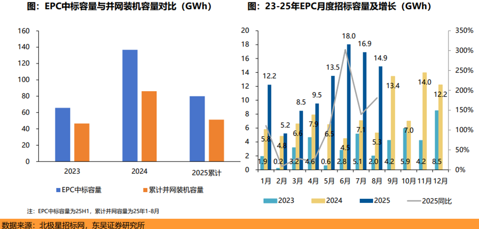储能建设未完全落地,后续装机兑现空间充足。25年H1,EPC中标容量约80GWh,25年1-8月累计并网装机容量51.3GWh,中标容量大于并网装机容量,表明当前储能建设未完全落地,订单高景气为未来装机增量奠定基础,下半年储能并网规模有望快速释放。