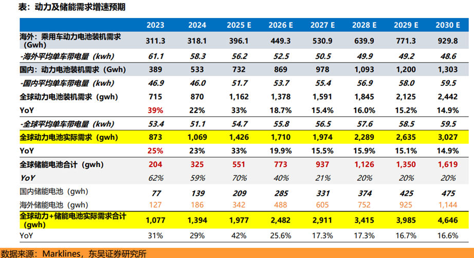 全球25年动储需求预计1950GWh ,同增42%,同时26年预计动储需求2482gwh,同比增26%,此后依靠海外电动化提速和储能持续高增,预计仍可维持15-20%复合增长。