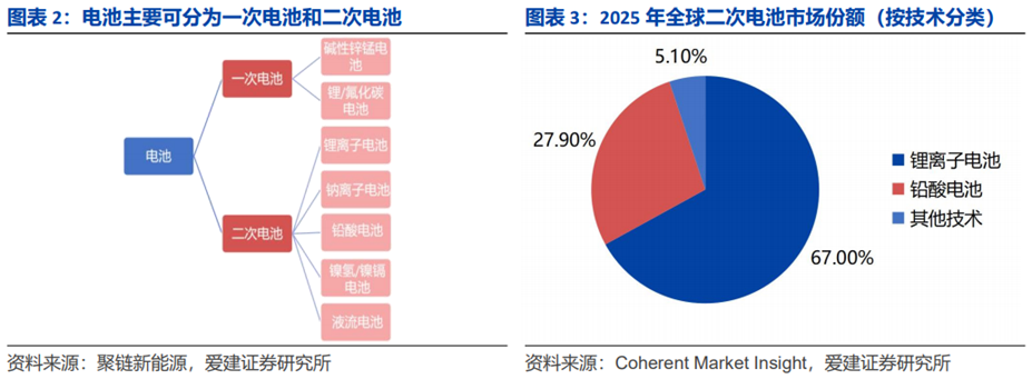 2、分类:锂离子电池占主要地位,新兴技术快速成长