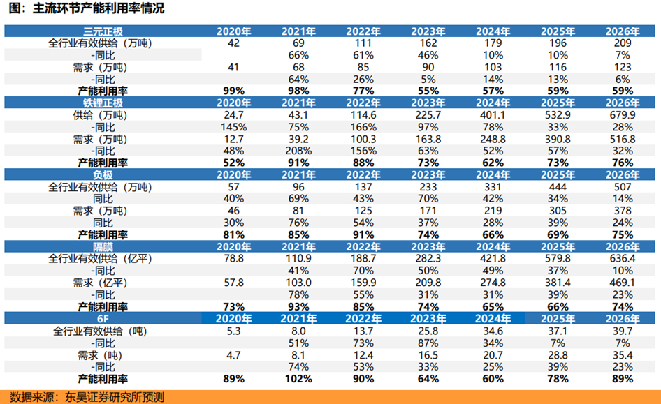 动储需求两旺,24年起电池龙头率先开始有序扩产,但材料厂商扩产相对谨慎,26年行业拐点明确。25H2起需求超预期,行业产能利用率明显改善,突破70%,且格局向头部厂商集中,预计26年行业供需进一步改善,其中六氟产能利用率预计达90%左右,铁锂达76%,改善明显。