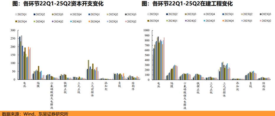 最近2季度电池资本开支有所恢复,而负极、正极资本开支放缓明显。25Q2三元前驱体、负极资本开支下滑明显,铁锂正极环比略降,隔膜、结构件等短期增加,电池受宁德时代拉动,资本开支维持高位。
