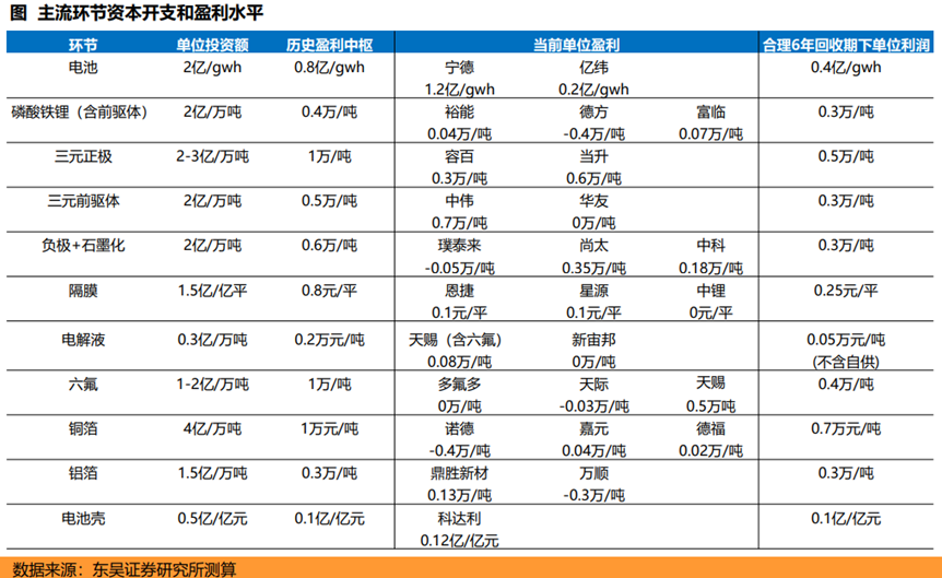 铁锂正极、电解液六氟、隔膜、铜箔、铝箔龙头盈利水平均低于合理水平,二线厂商基本全面亏损。价格已完全触底,小幅抬升,静待产能出清,龙头依靠技术升级,具备盈利优势。