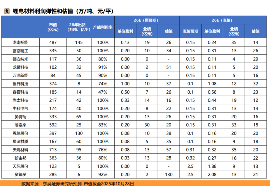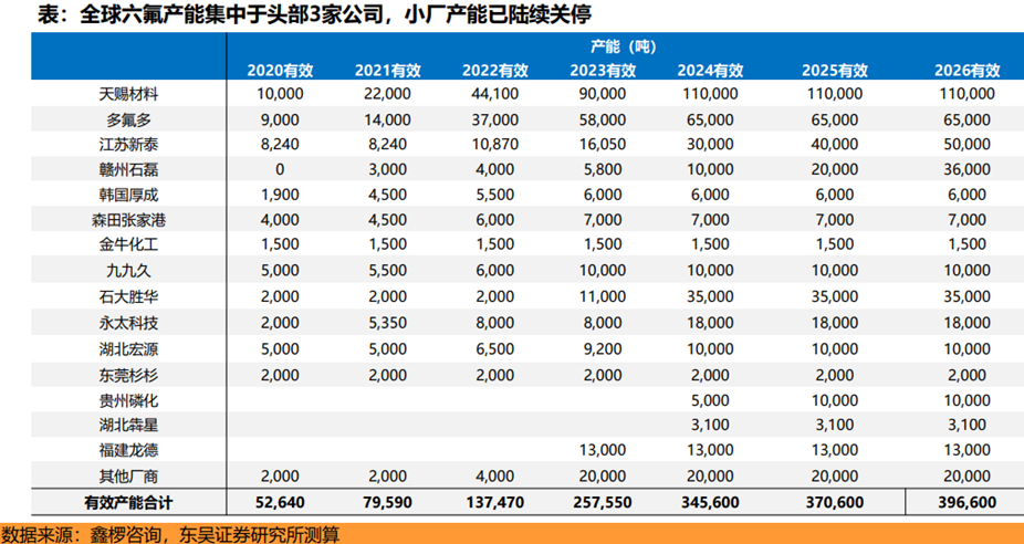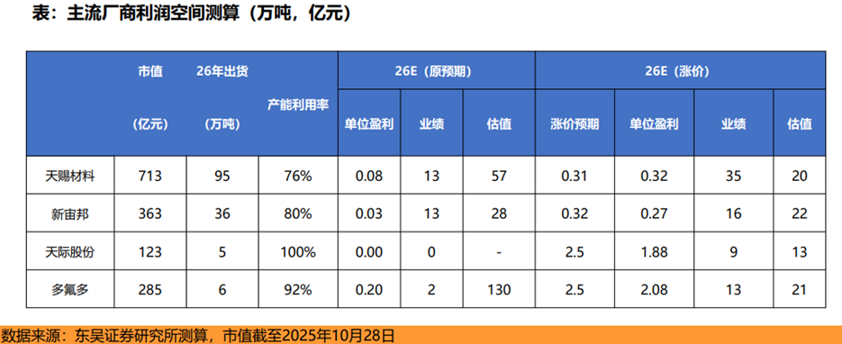 头部玩家挺价意愿强烈,25-26年除天际、石磊外,均无新增产能投产,行业供需拐点明确。天赐产能25、26年预计产能保持稳定,有3万吨产能不计划投产,多氟多25、26年无新增产能,天际当前满产,26年有扩产计划,预计新增1万吨,石磊预计由2万吨扩产至3.6万吨,其余厂商暂无扩产计算,且小厂由于成本较高陆续退出,头部市占率将继续提升。
