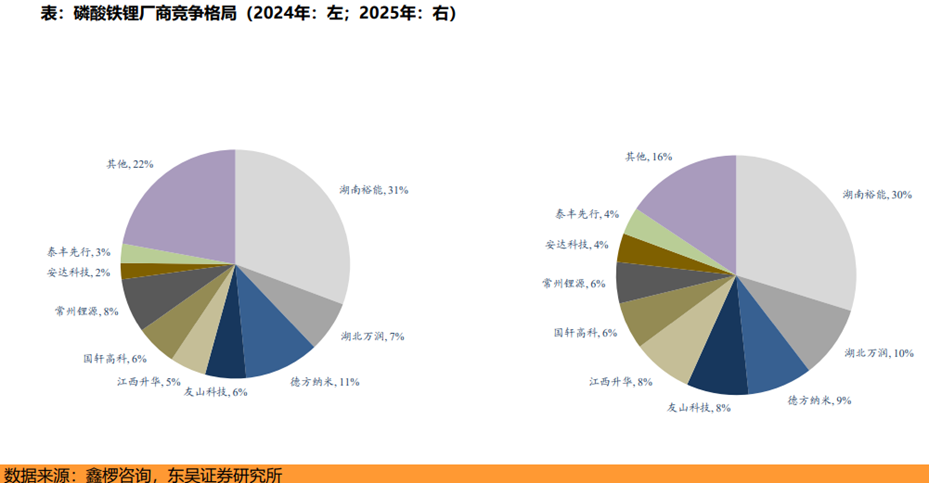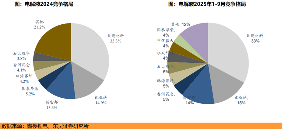 25年电解液龙头天赐地位稳固,尾部厂商开始出清。25年电解液价格继续下探,龙头天赐市占率保持30% ,比亚迪市占率达16.6%,较24年提升1.7pct,石大胜华电解液开始出货,份额较24年提升1pct,国泰华润份额下降,三四线厂商产能逐步出清。