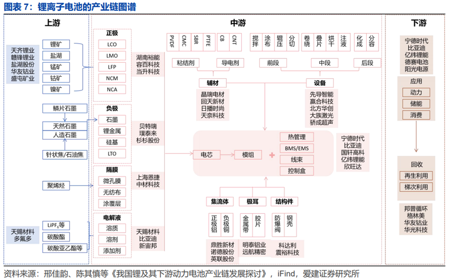 3、产业链:上游资源材料,中游材料电芯制造,下游应用和回收