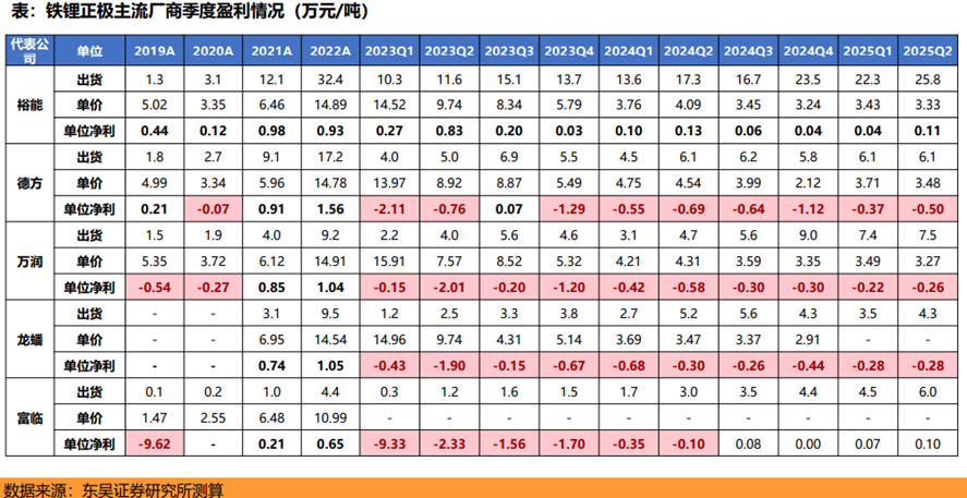 25Q2裕能、富临盈利好转,其余厂商亏损Q2有所扩大。25年Q2裕能单吨利润0.11万元,环比Q1大幅提升,富临高压实产品赚取技术溢价,Q2单吨盈利0.10万元,表现亮眼。其余厂商受碳酸锂跌价影响存在亏损,整体承压。