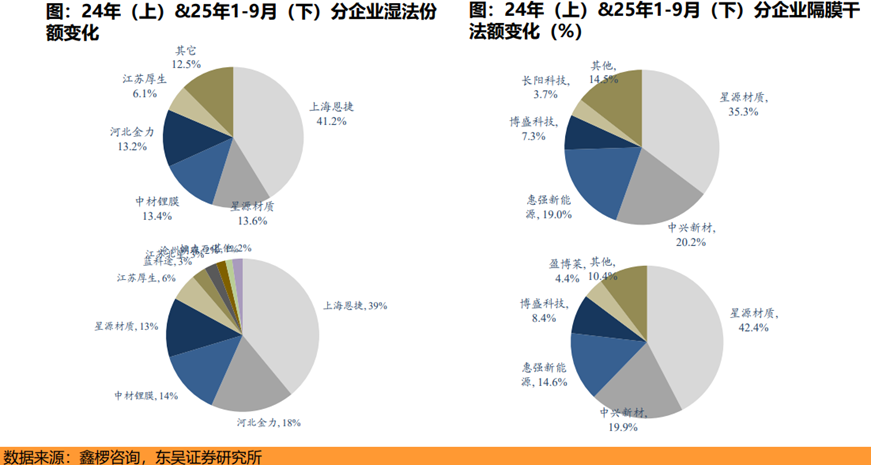 25年前9月龙头恩捷份额小跌,金力、中材等份额明显提升。25年1-9月隔膜出货208亿平,同比 39%,其中湿法隔膜167亿平,同比 47%。湿法方面,25年1-9月龙头恩捷份额相比24年下滑2pct,河北金力份额增长较快,占据18%,中材份额微增,星源基本持平。干法方面,25年1-9月龙头星源市占率相比24年增加7.1pct,市场地位进一步增强,中兴、惠强等二线厂商份额下滑。