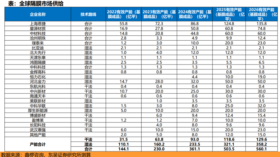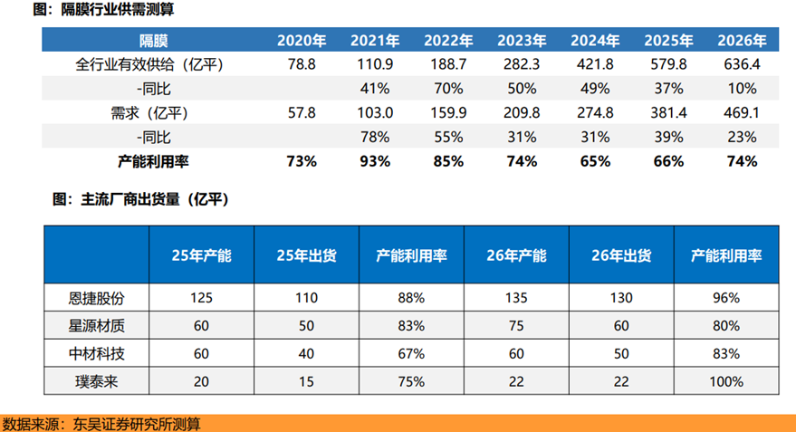 隔膜行业25年产能利用率底部企稳,龙头厂商满产满销,26年预计实现供需拐点。测算26年隔膜需求469亿平,增长23%,26年供给636亿平,增长10%,产能利用率预计从2025年的66%提升至2026年的74%。当前头部厂商湿法产能已满产,中材产能利用率提升至60% ,新进入者产能已基本投产,暂无新增产能大幅投产,干法产能联合挺价,26年供需拐点明确。