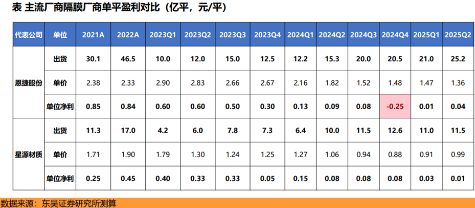 干法25Q1、Q3价格两次上行,行业内盈利修复。干法隔膜历经2024年的全面亏损,叠加成本上升,25Q1厂商报价普遍上涨,上涨幅度平均在10%-20%,个别最高涨幅超过20%,Q3干法价格进一步上行10%左右,对应行业内龙头厂商单位净利提升0.05-0.1元/平。