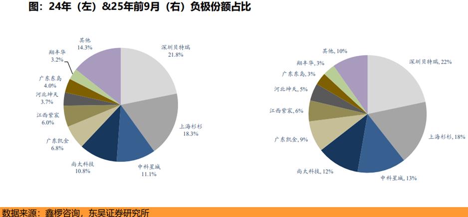负极厂商市占率分化,龙头份额稳定,中科、尚太份额提升,行业向头部集中。25年前9月贝特瑞份额22%,同比持平,仍居第一,上海杉杉以18%保持第二;二线厂商继续分化,中科星城、尚太科技份额达13%/12%,较24年 2pct/1pct,璞泰来基本持平,头部厂商份额进一步提升;尾部厂商开始洗牌,广东东岛、翔丰华等份额都略降,大部分厂商份额进一步降低。