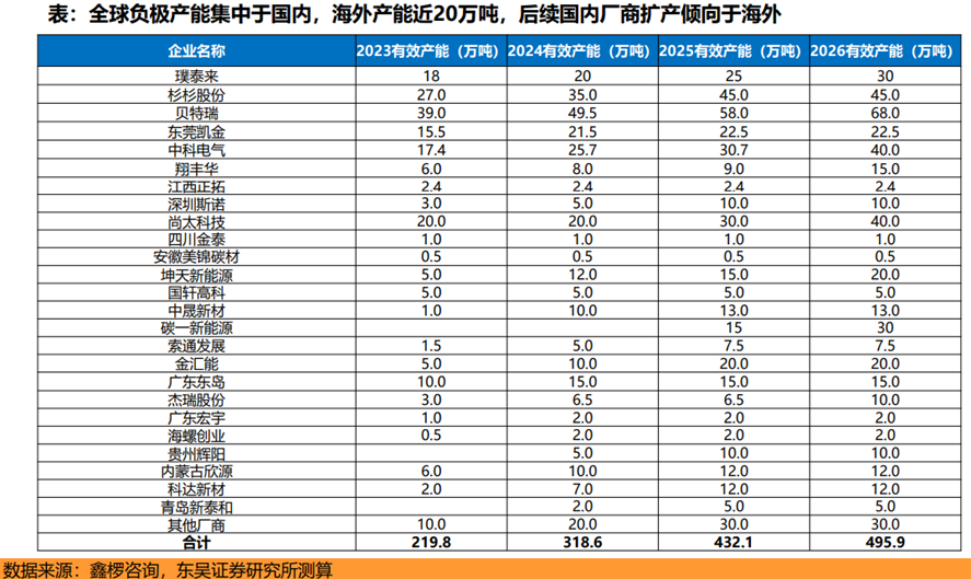 行业扩产集中头部,且头部厂商扩产倾向海外。尚太、中科、贝特瑞26年稳步扩产,杉杉受公司管理影响扩产放缓,行业扩产基本集中于头部,国内扩产基本放缓,后续贝特瑞、尚太扩产主要集中于海外,26年海外新增产能落地。