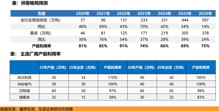 负极行业25年产龙头厂商满产满销,26年预计实现供需拐点。测算26年负极需求378万吨,增长24%,26年供给507万吨,增长14%,产能利用率预计从25年的69%提升至75%。当前头部厂商已满产,主流厂商扩产稳健。预计龙头可维持满产状态,行业供需改善。