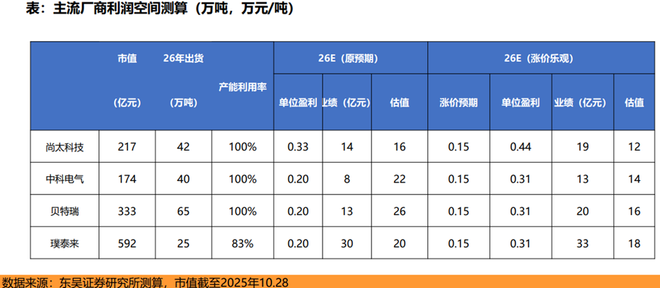 负极价格基本稳定,考虑海外产能弹性 自身降本,行业盈利有望逐步改善:26年头部厂商维持满产满销,随着海外产能落地,单位盈利明显高于国内,且尚太、璞泰来等新产能成本进一步降低,预计盈利可持续提升,行业盈利逐步改善。