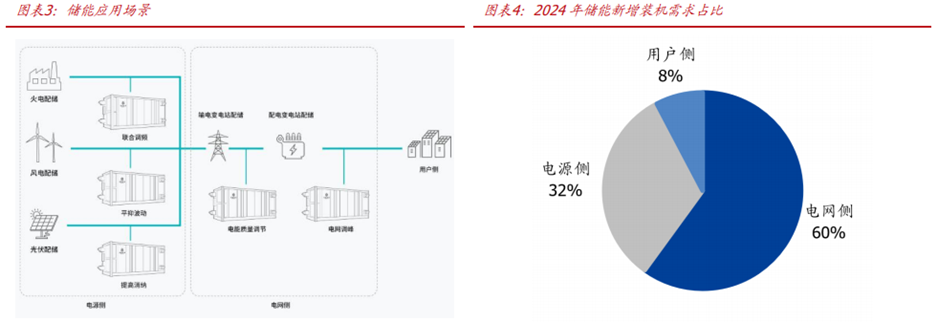 储能应用场景主要包括发电侧、电网侧、用户侧、微电网等场景。根据储能技术与市场,2024年电网侧储能新增装机占比达60.0%(装机能量口径),较2023年增加7.6%;其中独立储能占57.6%,是最主要的装机应用场景;电源侧储能占比32.3%,其中光伏及风电配储合计占比30.9%;用户侧储能占比7.7%,其中工厂配储是最主要的场景。具体来看:发电侧:包括电力调峰、可再生能源并网等,储能系统帮助新能源电站进行消纳、调峰调频和平稳输出,减少能量损失,提高电站功率预测性准确度,增加经济效益;电网侧:主要用于高压变电站、新能源高渗透区等,可参与调频、调峰、电压稳定、黑启动等电力市场辅助服务,获得相应的收益;用户侧:主要适用于大型厂区、工商业园区等储能项目,帮助用户调节各分布式电源和充电桩等灵活充放电,平滑负荷曲线,减少对大电网调峰和容量备用需求。还可以为数据中心等大用户供电;微电网:利用分布式能源、储能装置和可控负荷共同组成的低压网络,在微电网应用项目、无电区离网储能等项目上发挥作用。