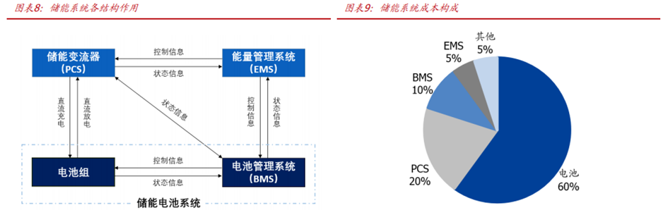 电芯和PCS是储能系统最核心组成部分。从构成上看,储能系统主要包括电池组、电池管理系统(BMS)、能量管理系统(EMS)、储能变流器(PCS)以及其他电气设备。成本结构来看,电芯占比达60%,PCS占比20%、BMS占比10%、EMS占比5%。在储能系统中,电池组将状态信息反馈给电池管理系统BMS,BMS将其共享给能源管理系统EMS和储能变流器PCS,EMS根据优化及调度决策将控制信息下发至PCS与BMS,控制单体电池/电池组完成充放电等。具体来看: