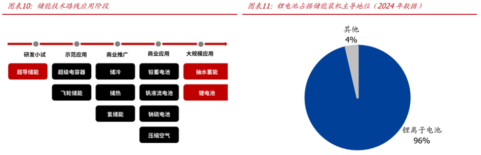 锂电池是最主流的储能技术路线。储能的技术路线多元,按照能量储存介质的不同,可分为机械储能、电化学储能、化学储能、电磁储能、热储能。其中锂电池储能隶属于电化学储能,以其放电速度快、循环次数高、能量密度高、技术成熟度高等优势占据了主要份额。根据国家能源局,2024年储能装机中锂电池占比高达96.4%,压缩空气储能、液流电池、铅酸电池占比分别为1.0%、1.0%、0.6%。