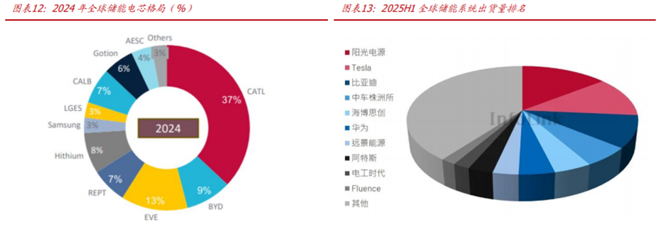 电芯:根据中商产业研究院,2024年中国储能电芯全球市占率超93%,其中2024年宁德时代、亿纬锂能、比亚迪、海辰储能、瑞浦兰钧、中创新航、国轩高科市占率分别为37%、13%、9%、8%、7%、7%、6%(ESS-NEWS数据);