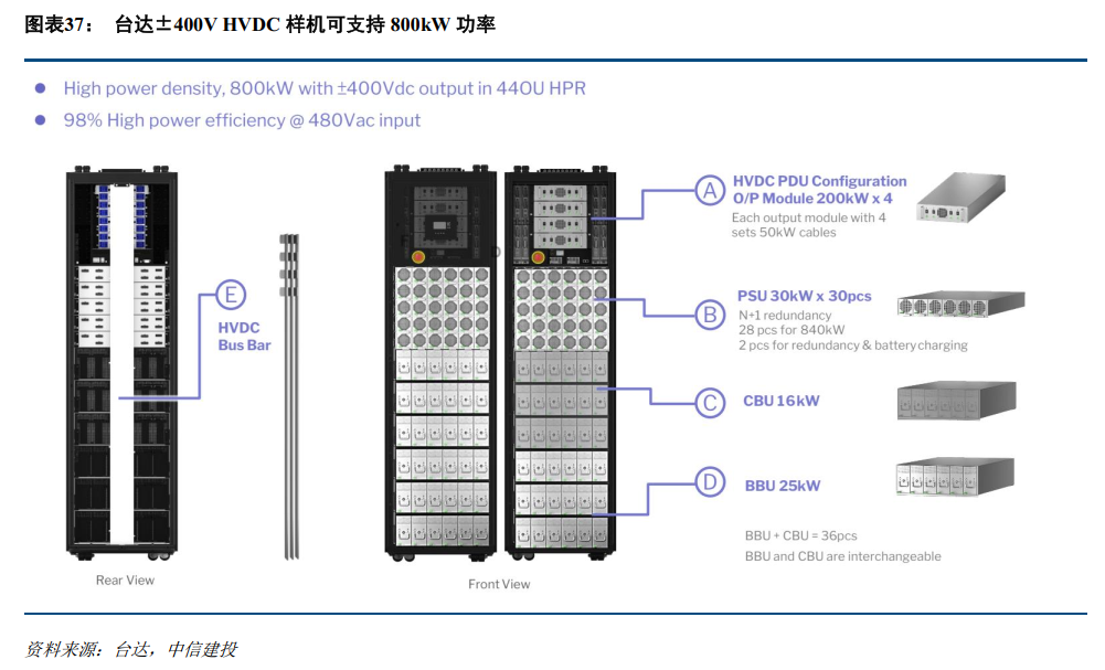 以台达推出的符合HPR标准的HVDC样机为例。该样机包含4个输出功率达200kW的PDU单元;30个PSU,每个输出功率达30kW,28个PSU为正常供电之用,另2个PSU用于冗余和为电池充电;此外还包含CBU(电容备份单元)和BBU(电池备份单元)共36个,两者之间可视需要互相替换,单个CBU输出功率为16kW,单个BBU输出功率为25kW。整台HVDC可输出800kW功率,高度为44OU,输入电压为480V交流,输出电压为±400V直流,效率达98%,以边柜(sidecar)形式布置在机柜旁,一台HVDC即可解决所有的供电、配电、备电、平滑负荷曲线的作用,从而给机柜中的计算设备让出了空间。