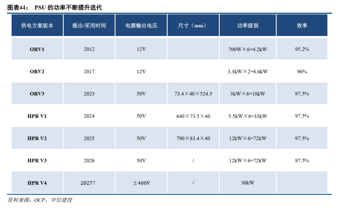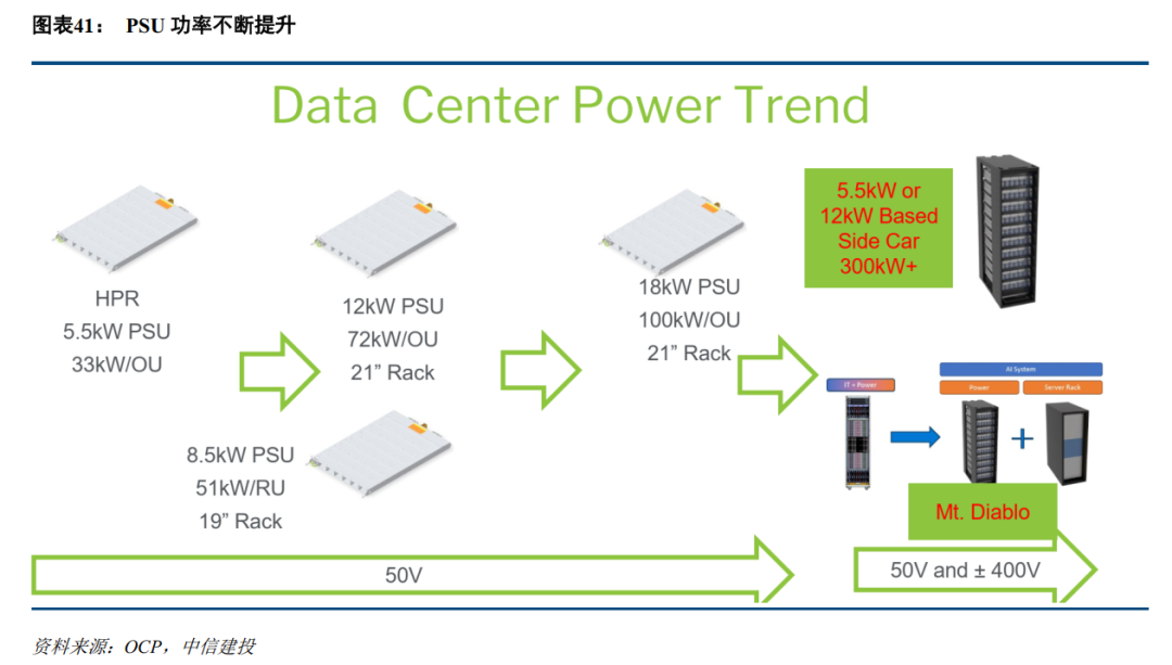 PSU通常指服务器机架上的AC/DC电源,主要将一次电源提供的415/480V交流电降压、整流为50V(当前广泛应用规格),其同时具备降压和整流作用。因为其体积层面受到机架限制较大,伴随服务器整体功耗快速提升,其功率密度也需要快速提升。目前采用B200、B300芯片的NVL72机柜,仍然采用5.5kW PSU,6个PSU成组为Power Shelf后功率为33kW。将来,随着HVDC逐渐开始使用,PSU从计算机柜中被挪动至HVDC sidecar中,同时,单体PSU功率水平提升至30kW级别,成组Power Shelf后提升至180kW级别。
