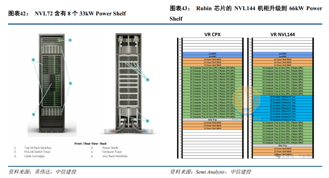 PSU通常成组使用,称为Power Shelf,如GB200 NVL72上使用了8个33kW Power Shelf,每个Power Shelf由6个5.5kW PSU组成。多个PSU成组可提升供电稳定性和冗余度。而在Vera Rubin这一代芯片的NVL 144机柜上,将升级至6个66kW Power Shelf。