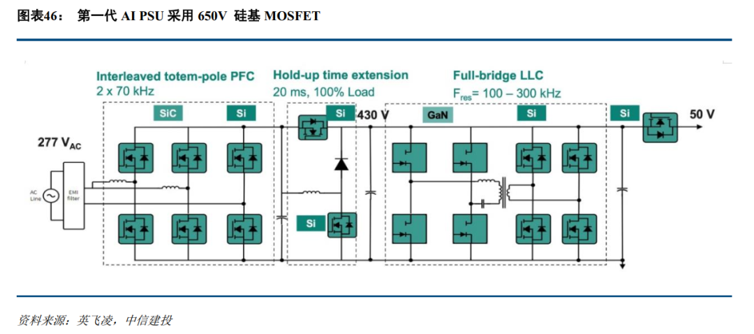 第一代AI PSU大多遵循ORV3 HPR标准,功率为5.5-8kW,采用277V 交流输入、50V直流输出。尽管每个Powershelf都通过400-480V交流三相输入,但每个PSU的输入仍为单相(230-277V交流)。在第一代AI PSU中,输入级采用两个交错的图腾柱拓扑结构,采用碳化硅MOSFET和硅基MOSFET混合形式;次级全桥整流器使用硅基MOSFET。