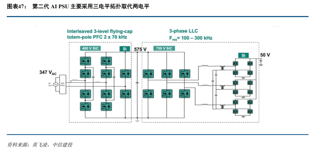 第二代PSU应对机架功率增加到300kW以上的情况,PSU单体功率提升至8-12kW,仍采用单相交流电输入,但电压等级从400/480V提升至600V,而输出仍保持50V直流。此时由于输入电压升高,输入级PFC的输出电压也提高到575Vdc,传统650V器件的耐压无法满足要求。因此第二代PSU采用400V 硅基MOSFET的三电平飞电容图腾柱PFC,能够使用较低额定电压的开关器件的同时,支持更高的输入电压。输出级则采用750V硅基MOSFET,并采用全桥输出级。