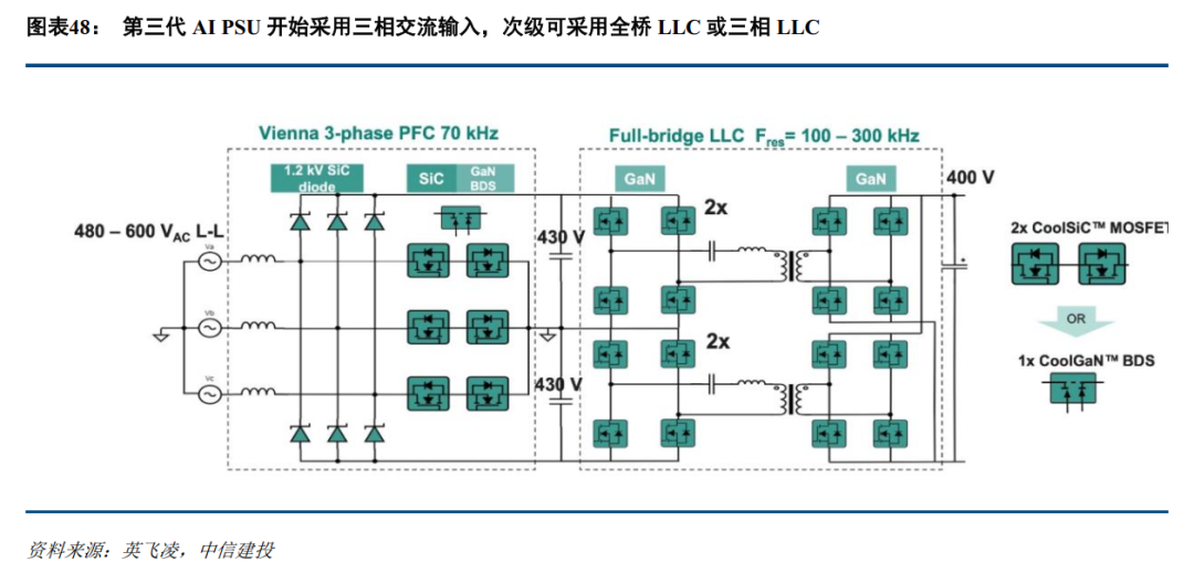 为了进一步支撑更高的机架功率,第三代AI PSU最高功率达到22kW,采用三相交流480-600Vac输入,同时采用400Vdc输出,以降低母线电流、损耗和成本。PFC输入级采用Vienna整流器,采用650V 碳化硅MOSFET和1200V碳化硅二极管。输出采用两组430V电容器,为全桥LLC转换器供电,在初级和次级均使用650V GaN晶体管。
