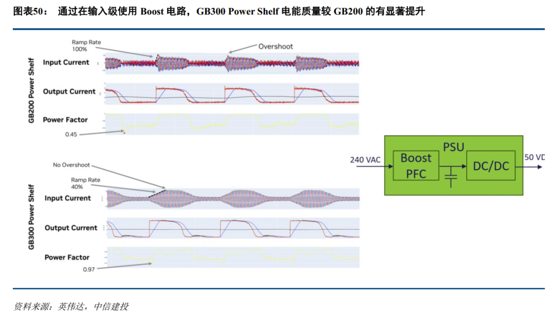 此外,随着芯片功率的提升,对PSU输出电源电能质量的要求也在提高。根据英伟达800V供电白皮书,通过在PSU输入级(PFC)使用Boost电路,大大减轻了输出电流波形的过冲现象,同时将电源功率因数从0.45提升至0.97。