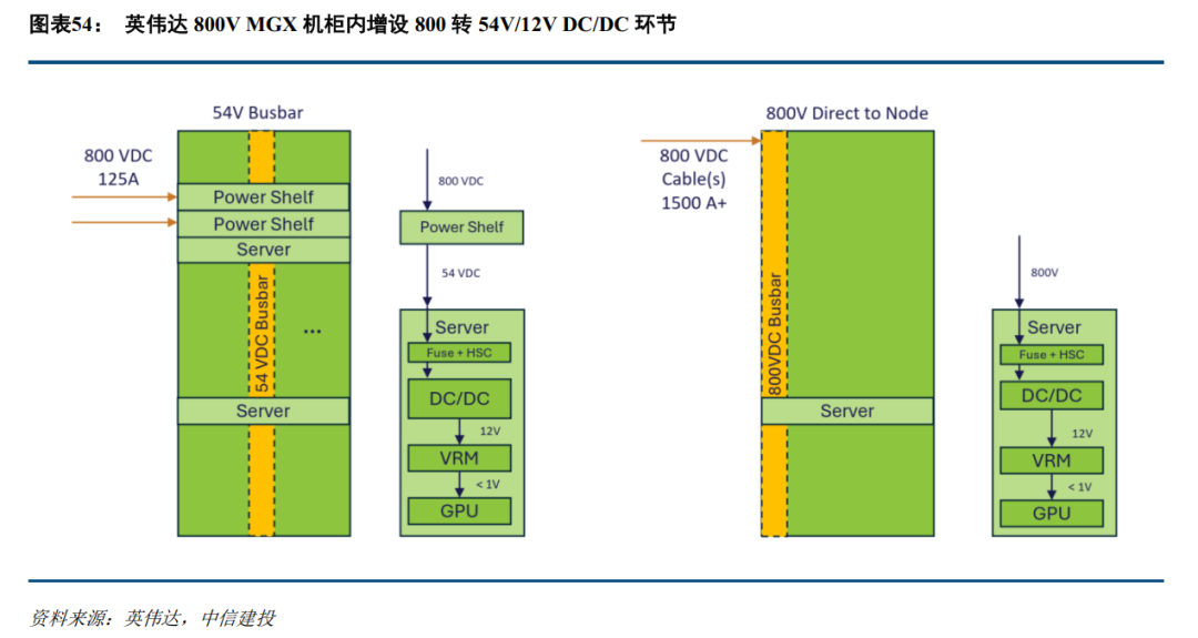 采用HVDC后,尤其是采用边柜(sidecar)形式的HVDC后,执行AC/DC转换的PSU从计算机柜被移出至HVDC sidecar中,计算机柜内不再含AC/DC环节。但HVDC输出的800V/±400V直流电入柜后,计算卡无法直接利用这么高的电压,需增设800V/±400V转50V/12V的DC/DC环节,安装在原先属于PSU的机柜内部空间中。