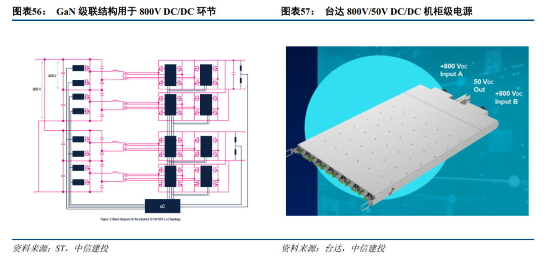 功率器件与功率模块在HVDC系统中起到至关重要的作用。传统240V/336V HVDC场景中常采用IGBT或者SiC,而随着电压等级提升至800V,使用宽禁带半导体(如SiC、GaN)能够在更高的开关频率下,实现最佳效率和更高的功率密度以降低损耗与体积,成为AI PSU的理想选择。