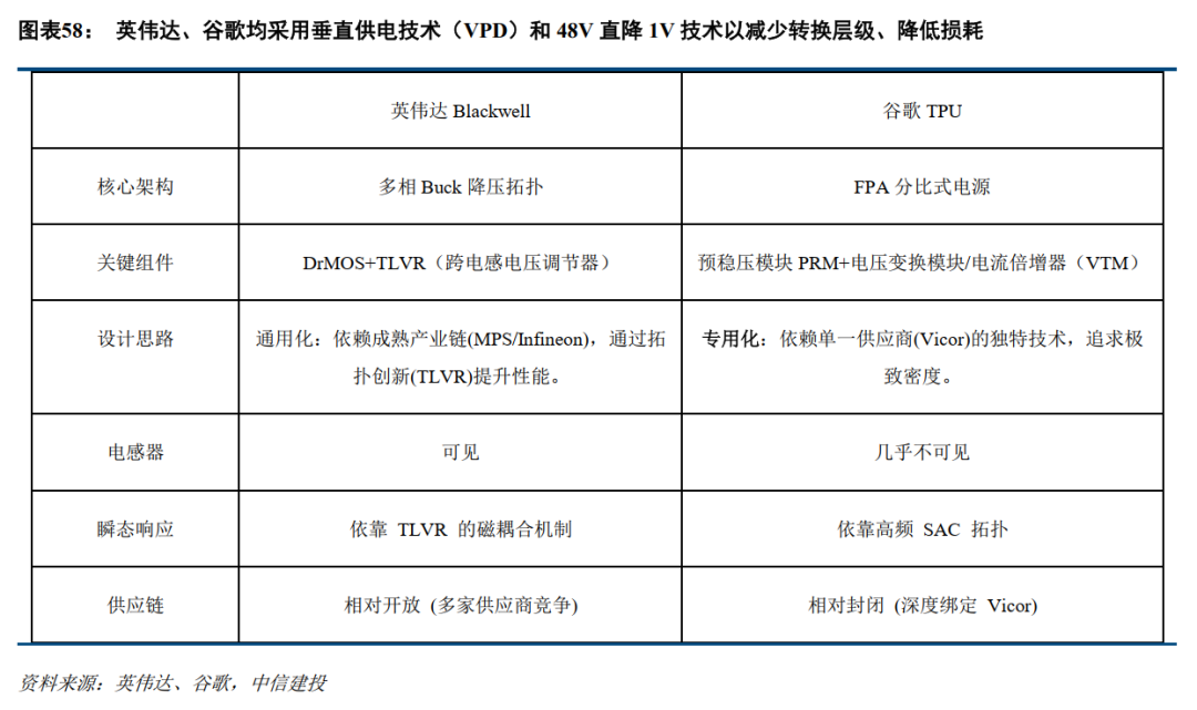 谷歌TPU芯片的三次电源方案与英伟达不同,采用FPA架构(主要由Vicor提供),采用预稳压模块(PRM)和电压变换模块(VTM)结合,前者输出一个稳定的、受控的电压,但不进行大幅度的降压;后者为电压变换模块/电流倍增器(VTM)放置在极度靠近TPU芯片的地方,不负责稳压,只负责按照固定比例变压,如将48V直流变成1V,同时电流放大48倍。同时工作在MHz级别的极高频率、采用软开关技术降低开关损耗,使得谷歌的VTM模块体积极小,响应速度极快,可以像积木一样堆叠在TPU旁边。并且谷歌比英伟达更早大规模应用垂直供电(VPD)理念。