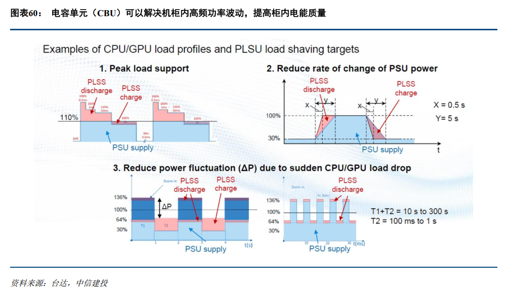 电容备份单元(Capacitor Backup Unit,CBU)是用于提高机柜内部电能质量的设备,可以快速充放电,用于解决数千Hz频率的GPU/CPU负载波动和PSU输出功率波动的问题。用于: