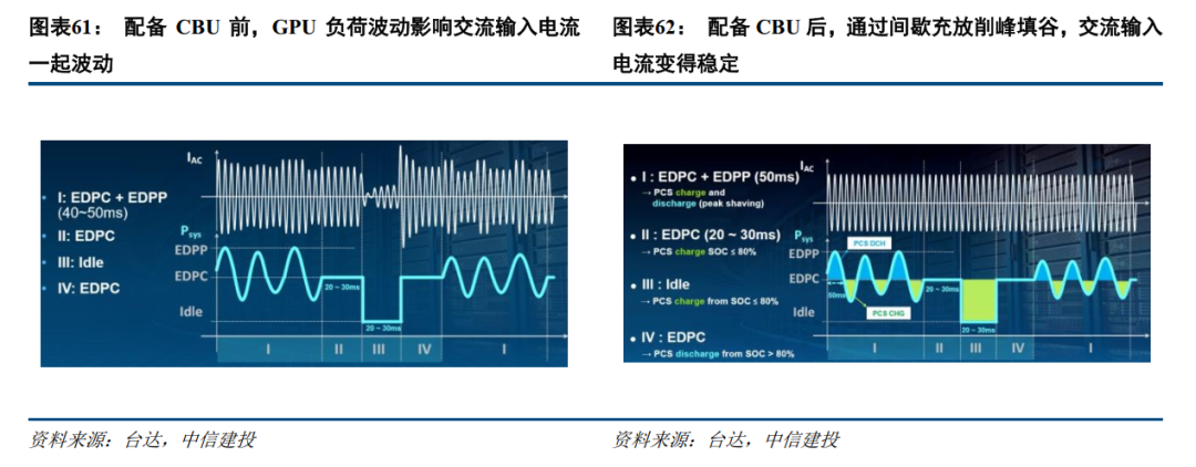 配备CBU后,通过CBU间歇性充放电(时间间隔在数十ms量级),可以有效平抑GPU负荷波动带来的输入电流波动,从而减轻PSU的工作负担,并提高整个机柜的电能质量。