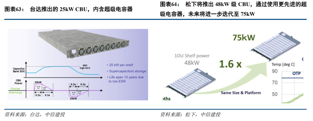 目前,推出CBU较为成熟产品的是台达和松下,台达已推出单体25kW的CBU shelf,目前松下的CBU shelf单体功率也在25-26kW量级。未来,2025年松下将推出48kW级CBU shelf,后续将进一步迭代至75kW。