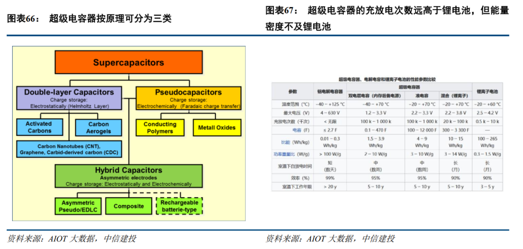 CBU内部的核心零部件为超级电容器,是拥有高能量密度的电化学电容器,比传统的电解电容容量高上数百倍至千倍不等,其容量和性能介于电解电容和蓄电池之间。超级电容的吞吐速度可比电池快得多,充放电周期也远多于蓄电池。但超级电容器也有缺点,除成本高于主流电池,在性能方面它还面临着峰值功率密度低(最高30 kw/kg)、能量密度低(约10 wh/kg)、工作电压低(小于 3V)的挑战,核心原因在于其电极材料和电解质无法承载高压。