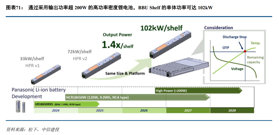 BBU内部采用锂电池供电,为保证高功率输出,通常采用三元圆柱电池,目前多采用18650规格的圆柱电池,随着机柜功率的提升,也逐步开始采用21700等更大容量的电池。目前,松下在BBU Shelf和BBU所用的三元圆柱电池方面居于领先地位,根据松下在OCP大会上的资料,目前松下的BBU Shelf输出功率72kW,符合 HPR v2标准,未来通过采用更高能量密度的三元圆柱电池(预计为21700规格),单颗电池输出功率达到200W,成组为BBU Shelf后,单个Shelf可以输出102kW。