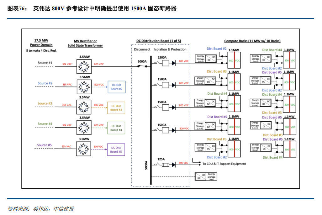 英伟达在800V供电白皮书中给出了设计参考案例,其中为了保证安全输送800V电源,明确提出在直流配电环节使用1500A固态断路器、阻塞二极管,以及故障保护装置,每个1.1MW机柜使用一只1500A固态断路器进行保护。