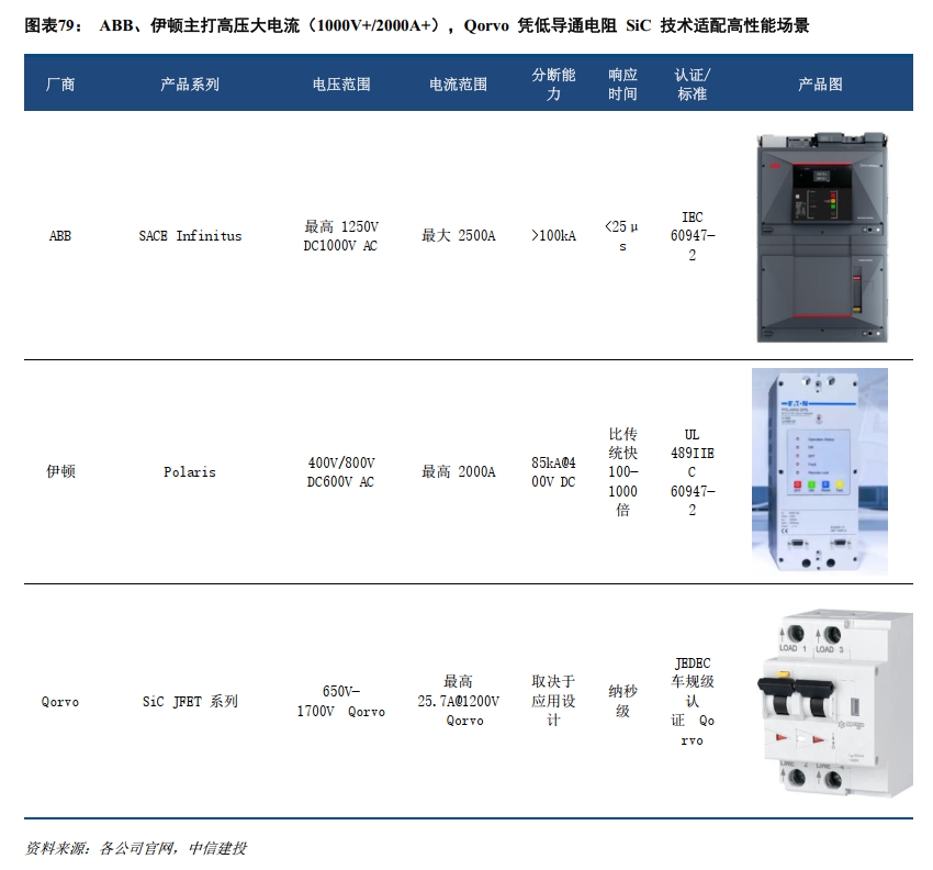 在国际固态断路器市场中,高压大电流领域以ABB SACE Infinitus和伊顿Polaris系列为代表,电压可达1000V 、电流达2000A ;高性能应用场景下,Qorvo SiC JFET技术领先,导通电阻低至4mΩ,适配高频高效率需求。